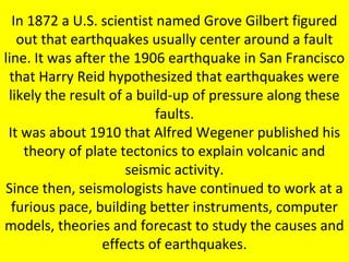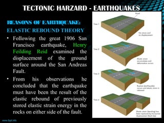 With the development of any explanation of a phenomenon comes the ability to predict or forecast future events related to that phenomenon. Elastic-rebound theory Geophysicist Harry Fielding Reid examined San Andreas Fault and concluded that the quake must have been the result of the elastic rebound of the strain energy stored in the rocks on either.